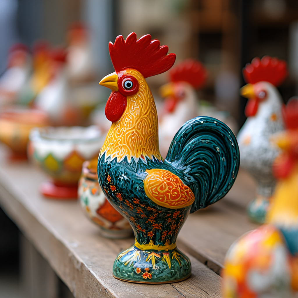 A close-up of a ceramic figurine of the Rooster of Barcelos, brightly colored with traditional patterns, placed among other diverse pieces of Portuguese handicraft on a wooden table at an outdoor market stall